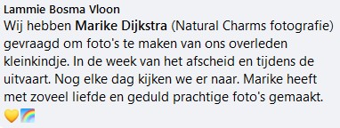 Bij mij is het mogelijk niet alleen de uitvaart te laten fotograferen, maar ben ik er voor jullie vanaf het allereerste moment. Dat kan zijn vanaf de geboorte, thuis of in het ziekenhuis, tot en met de laatste eer tijdens de uitvaart.